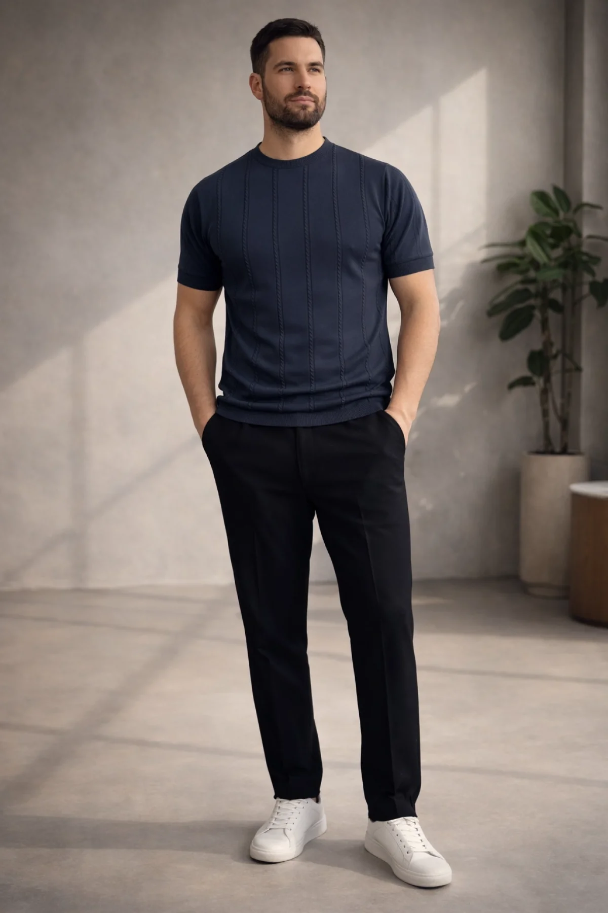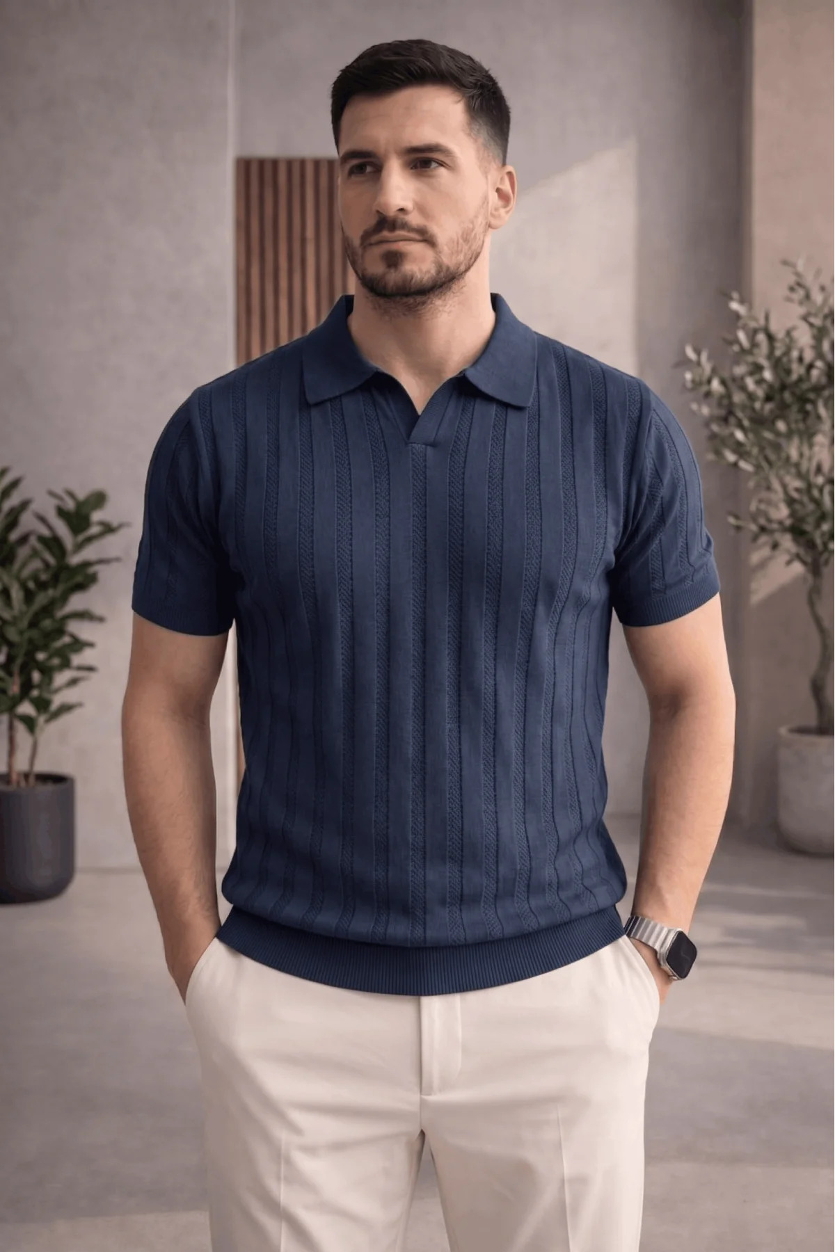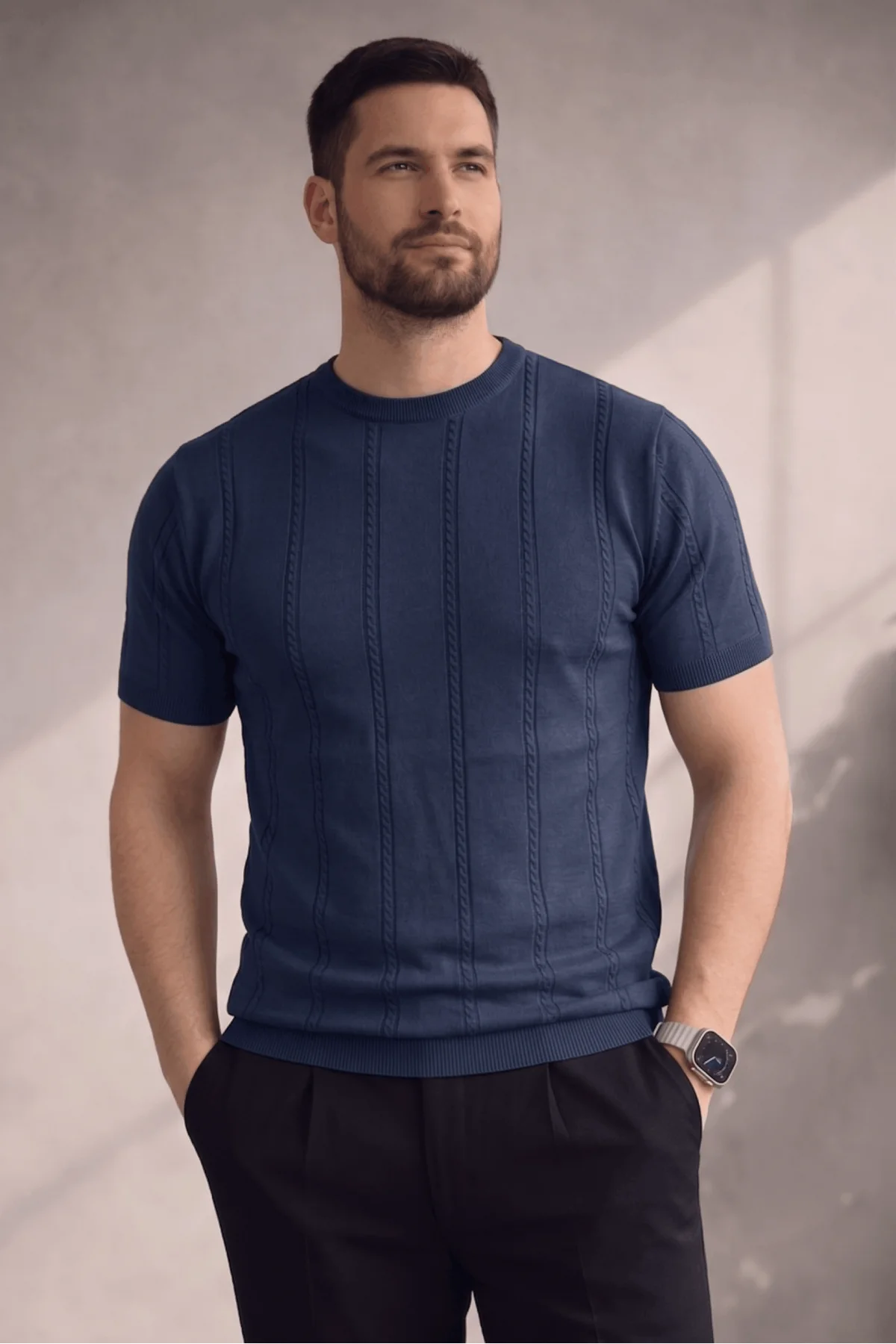 Erkek Açık Yaka Desenli Triko Tişört Lacivert Cd162
