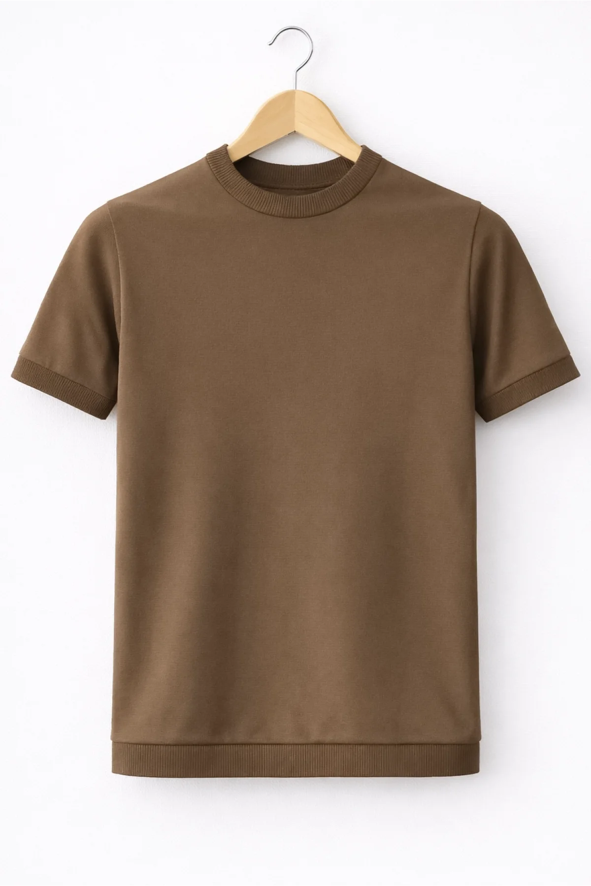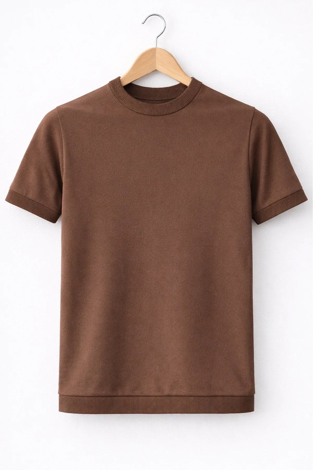Erkek Düz Bisiklet Yaka Triko Tişört Kahverengi Cd169