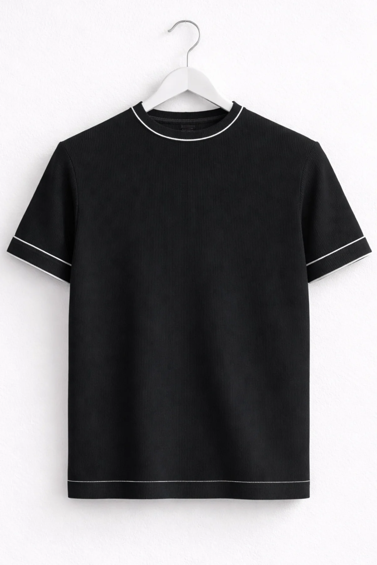 Erkek Bisiklet Yaka Çizgi Desenli Triko Tişört Siyah Cd170