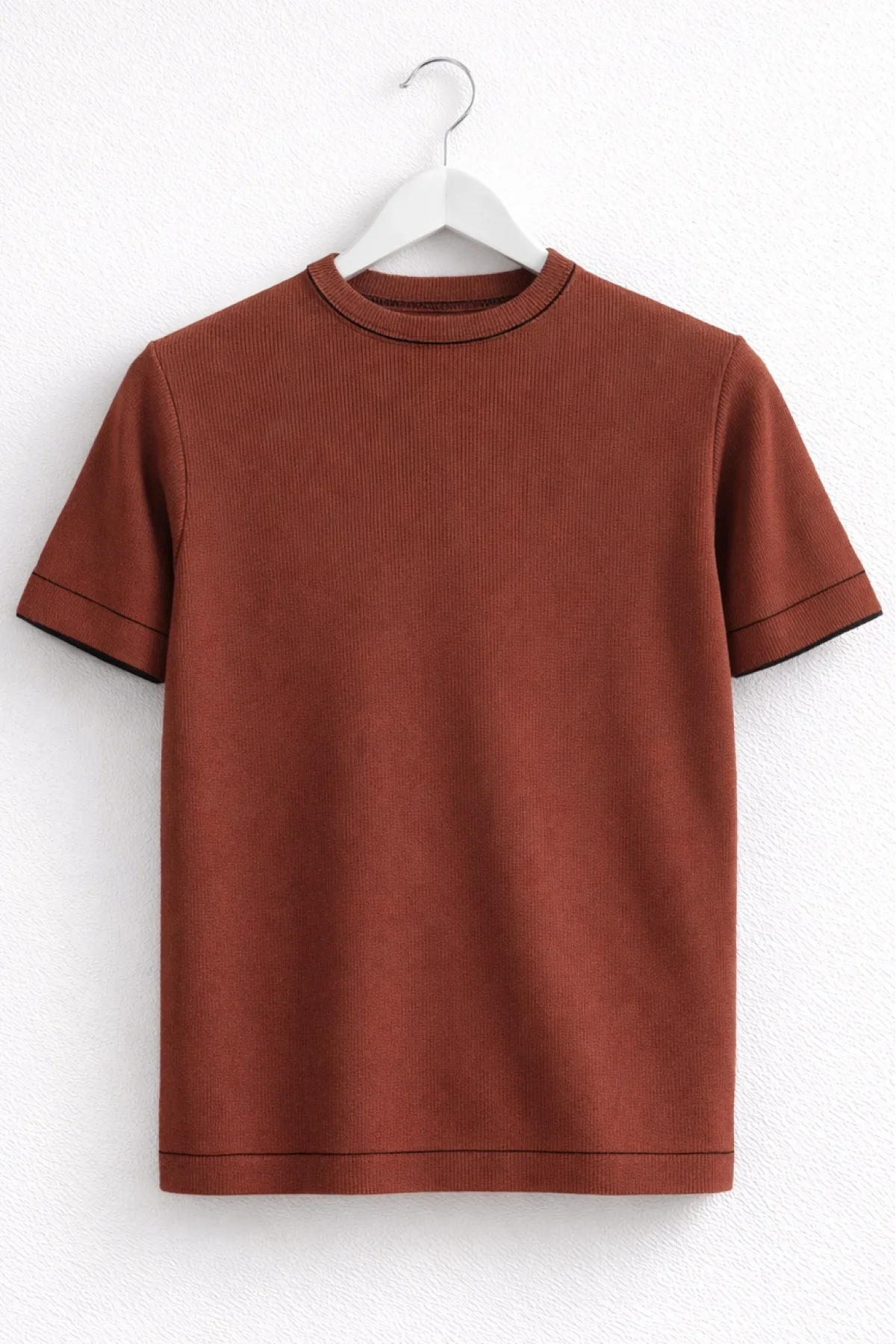 Erkek Bisiklet Yaka Çizgi Desenli Triko Tişört Kiremit Cd170