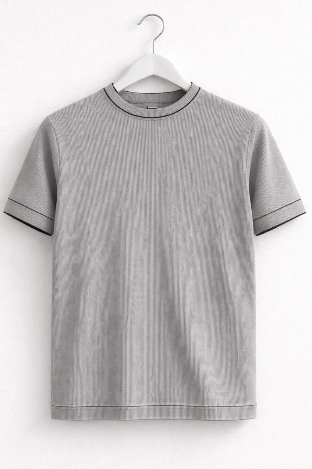 Erkek Bisiklet Yaka Çizgi Desenli Triko Tişört Gri Cd170