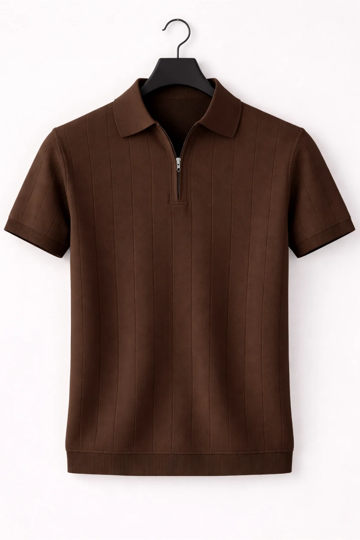 Erkek Polo Yaka Çizgili Triko Tişört Kahverengi Cd171